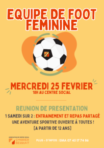 L’équipe de foot féminine du centre social : c’est l’occasion de se retrouver, bouger et passer un bon moment ensemble. On joue pour le plaisir, pour transpirer un peu, et rigoler beaucoup ! Après l’effort, place au réconfort : on se retrouve autour d’un repas partagé, au soleil, avec de la super musique !Du sport, du collectif, de la bonne humeur : voilà notre championnat ! A partir de 12 ans, jusqu’à 105 ans !
